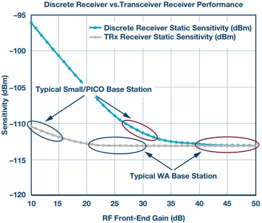 动态灵敏度如何呢?在射频前端增益区域,我们会使用收发器设计广域基站,动态灵敏度也比分立解决方案好得多。这是因为较低增益的RF前端在给定功耗下通常具有较高的线性度。在通常使用高增益的分立解决方案中,线性度常常由RF前端决定。在收发器设计中,与分立解决方案相比,干扰导致的灵敏度降幅显著降低。