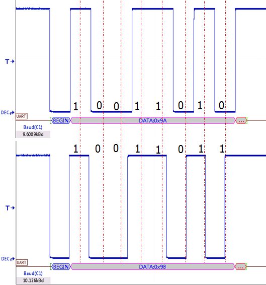 当解码时设置的波特率同为9600时,采样点的位置是根据9600的波特率来确定的,当实际采样率和9600bps有偏差时,误差会逐渐累积,从而导致解码有偏差。设置的数据位宽越大,越容易叠加误差。