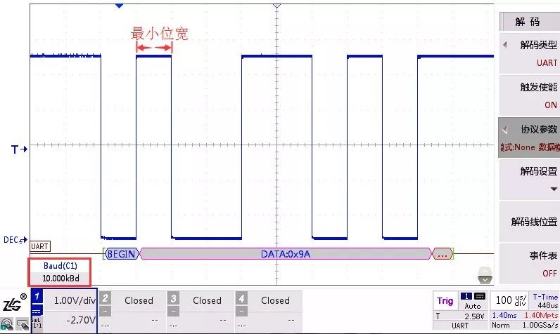 二、自检波特率方法从波形出发,根据波形最小位宽估算波特率,此法适用于波特率偏差较大或不确定波特率该设置多少时。这是工程师们较习惯的自检方法。估算波特率需要看波形中的最小位宽,从来图2看,时基档位为100us,最小位宽刚好占一格,则最小位宽为100us左右,换算之后等于10000bps。
