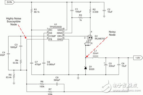 最严重的寄生电容问题通常会涉及反馈 (FB) 电压以及误差放大器补偿节点的布局。这是由于误差放大器输入的高阻抗、误差放大器的高增益,以及大量连接至该节点的组件。图 1 显示了典型控制器中出现这一问题的位置,以及一个较为可能的耦合节点。Q1 和 D1 之间的连接约有 0.1 V/ns 到 1 V/ns 的极高转换速率,并且会形成仅 1 pF 寄生电容的 1 mA 电流。