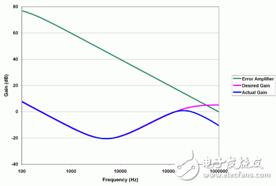 第二种常见错误是让放大器提供超出其能力范围的增益,图 2 描述了这种错误。它显示了理想的误差放大器频率响应、放大器的增益以及给定误差放大器限制的预计性能。由于其带宽限制的存在,放大器无法给出理想的高频增益。尽管图中未能显示,但相位也受到严重的影响。电压模式转换器(如图 1 所示)中需要高频大增益,这时问题会更加突出。设计误差放大器补偿时,请特别注意其带宽限制,否则您最终需要使用一个震荡电源。