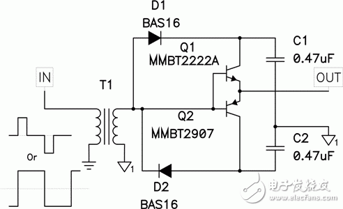 图 3 显示了一款可使您跨越隔离边界的简单缓冲器变量情况。一个信号电平变压器由一个对称双极驱动信号来驱动。变压器次级绕组用于生成缓冲器电力并为缓冲器提供输入信号。二极管 D1 和 D2 对来自变压器的电压进行调整,而晶体管 Q1 和 Q2则用于缓冲变压器输出阻抗以提供大电流脉冲,从而对连接输出端的 FET 进行充电和放电。该电路效率极高且具有 50% 的占空比输入(请参见图 3 中较低的驱动信号),因为其将驱动 FET 栅极为负并可提供快速开关,从而最小化开关损耗。这非常适用于相移全桥接转换器。