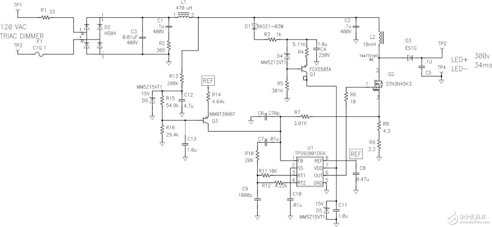 图2 显示了一个通过 120 伏 AC 电源为 LED 供电的非隔离式电路。它包含一个为降压功率级供电的整流桥。该降压调节器是一个“倒置版”,其电源开关 Q2 处在回路中,而环流二极管 D3 连接至电源。在电源开关导通期间,通过一个源电阻对电流进行调节。尽管这样做的效率相当高(80%-90%),但是这种电路存在几个限制效率的缺点。导通时,电源开关必须承载全部输出电流,而在电源开关关闭时,输出电流流过环流二极管。另外,电流检测电阻器 R8 和 R10 的电压约为 1 伏。相比 15 到 30 伏的 LED 电压,所有这三个压降都很大,并且会对电源效率构成限制。更为重要的是,这些损耗会促进灯泡温升。LED 的发光能力会慢慢减小,而这种能力与LED的工作温度密切相关。例如,70oC 条件下,LED 光输出减少30%的时间超出了 50000 小时,而在 80oC 条件下,这一时间仅为 30000 小时。由于灯泡都安装在一些“筒”中,而这些“筒”往往会阻碍散热,不利于对流冷却,因此发热问题被进一步复杂化。