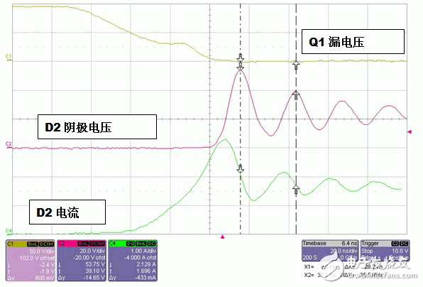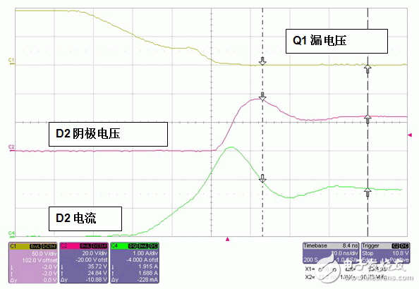 图 2 显示了一些电路波形,顶部线迹为 Q1 漏电压,中部线迹为 D1 和 D2 结点处的电压,底部线迹为流经 D1 的电流。在顶部线迹中,您可以看到当 Q1 打开时,其漏电压被降至输入电压以下,这样就使得二极管 D1 电流增加。如果 D2 没有逆向恢复充电功能,当 D1 电流等于输出电流时,结点电压就会上升。由于 D2 具有逆向恢复充电功能,因此 D1 电流会进一步增加,这便开始消耗电荷。一旦电荷耗尽,二极管便关闭,从而导致增加的结点电压进一步提高。请注意,电流会不断增加直到结点电压等于反射输入电压为止,因为在漏电感两端有一个正电压。随着电流的增加,该电流将对寄生电容进行充电并导致电路中振铃和损耗更大。