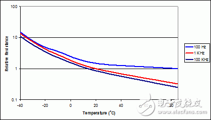电容器温度较低时,ESR 急剧增加,如图2所示。在这种情况下,-40oC 下,电阻呈数量级增加。这在许多方面都会影响到电源性能。如果电容器用于开关式电源的输出端,则输出纹波电压呈数量级增加。另外,在 ESR 和输出电容形成的零以上频率,它让环路增益增加一个数量级,从而影响控制环路。这会产生一个有振荡的不稳定电源。为了适应这种强震动,控制环路通常会在空间方面做出巨大妥协,并在更高温度下工作。