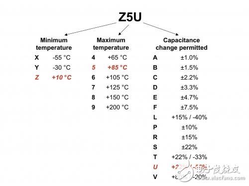 温度和DC偏压变化时,陶瓷电容器介电常数不稳定,因此我们需要在设计过程中理解它的这种特性。高介电常数陶瓷电容器被划分为 2 类。图1显示了如何以 3 位数描述方法来对其分类,诸如:Z5U、X5R 和 X7R 等。例如,Z5U 电容器额定温度值范围为 +10 到 +85oC,其变化范围为 +22/–56%。再稳定的电介质也存在一定的温度电容变化范围。