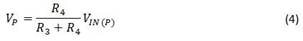 您还可看到R3和R4在同相输入端形成了一个分压器。方程式4计算出的运放同相输入端(VP)电压为: