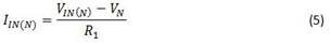 这为什么很重要呢?哦,因为该电压可部分决定反相输入端的有效输入电阻。考虑到通过R1的电流(IIN(N))等于跨R1的电压除以其电阻(方程式5):