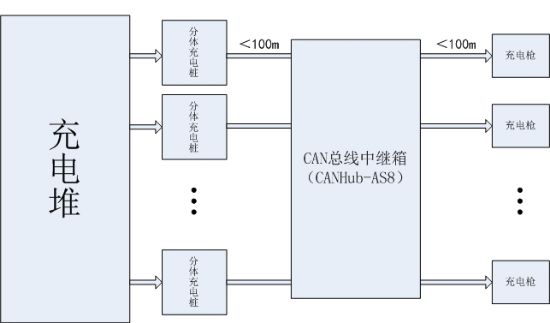分体式充电桩往往一个充电堆配套十几个充电桩,大电流线与通讯线并行、远距离通讯和多路CAN总线通讯,要求中继器具备以下特点:隔离干扰、良好的信号优化能力、多路CAN接口、能兼容不同波特率。