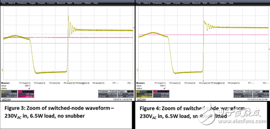 图1和4显示的是在缓冲器安装和移除后,同一元件传导性放射间的差异。这些波形显示了两种情况下泄露电感尖峰间的差异。