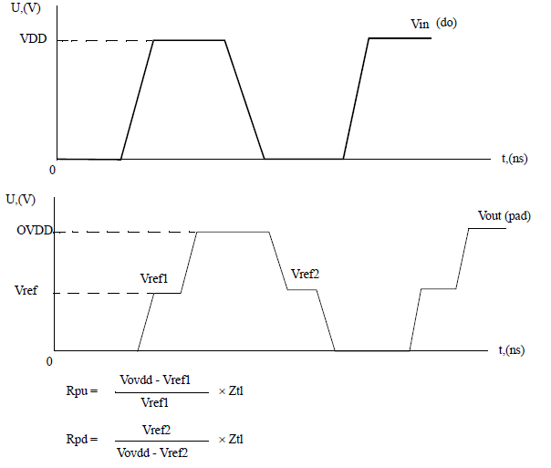 此处以DO为示例,Rpu/Rpd和Ztl构成一个分压器,定义入射波相对于OVDD的特定电压,输出驱动阻抗是从这个分压器计算出来的。