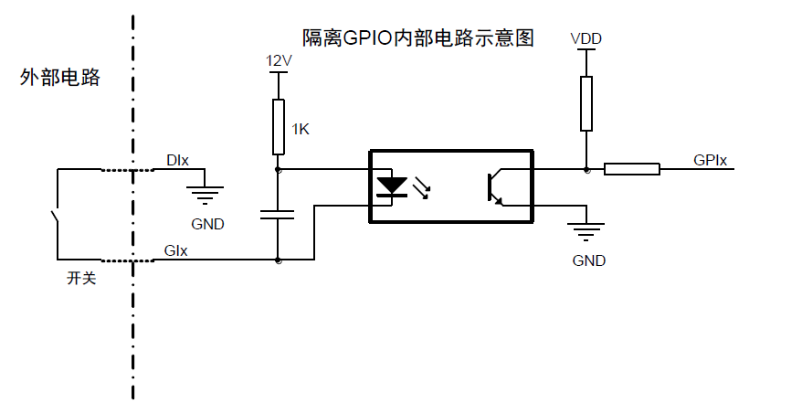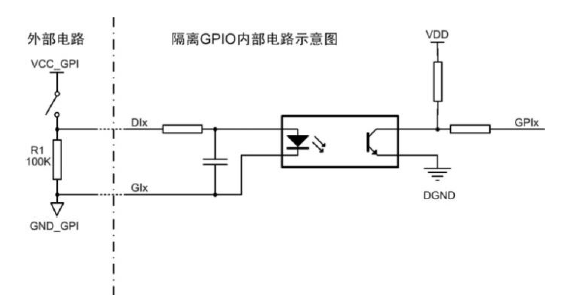 DI作为隔离数字量输入接口,接开关量输入时,用户必须在外部电路加上拉电源,简化的连接示意图如图6所示。其中VCC_GPI为外部隔离电源,输入范围为4V~18V,GND_GPI为外部隔离地,电阻R1在开关断开时保证GIx为低电平,阻值为100KΩ即可。