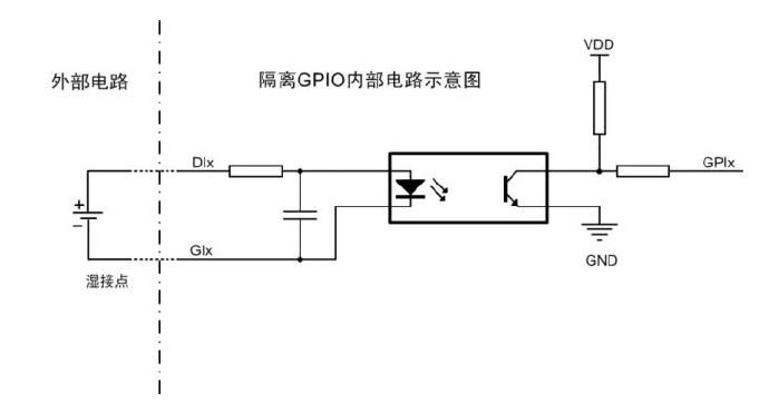 图5是光耦隔离数字量湿节点设计参考电路,输入电压范围DC4V-18V,并且内部自带滤波功能。用户只需将湿节点的正端接于DIx接口,将负端接于GIx接口,当输入的电压大于4V小于18V时,光耦导通;当输入的电压小于1V时,光耦截止。