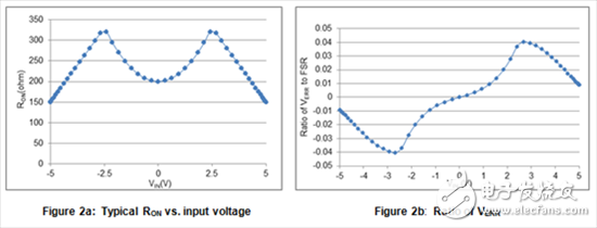 图2a显示的是典型RON值与互补金属氧化物半导体 (CMOS) 模拟开关的输入电压之间关系的曲线图。非线性导通电阻调制稳定时间常量,这样的话,如图2b所示,在tAQ结束时,输入正弦波与采样电容器上的信号之间的残余电压误差 (VERR) 也是非线性的。如果导通电阻是完全恒定的,误差曲线将是一条直线(如图3a和3b中所示),ADC输出上将不会出现失真。