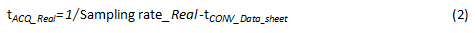 通过直接减少采样率来增加采样时间。你可以用方程式1计算出真实的采样时间,通过减少采样率来增加tACQ_Real时间,这是因为ADC数据表中为(转换时间)指定了一个最大值(方程式2):