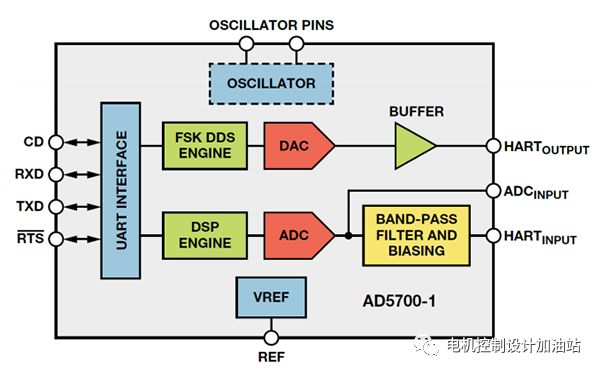 图 2 中显示的其他三个模块是上文提及的UART接口、内部基准和振荡器。RTS和TXD是用于调制的重要信号,而CD和RXD则对解调非常重要。AD5700 可以接收外部 2.5 V基准,只有在AVDD电源大于 2.7 V时才能使用。对内部或外部基准选项的使用受REF_SEL针脚的极性控制。对于时钟,该器件支持多个方案,以实现简单的低成本可配置解决方案。AD5700 可以使用外部晶体、陶瓷谐振器或CMOS输入。AD5700-1 是首款集成内部低功耗 0.5%精密振荡器的HART调制解调器IC,降低了所需的外部电路以及总体成本。众多片上集成功能显著简化了HART兼容系统的设计,从而提供更加可靠和经济高效的稳定网络解决方案。