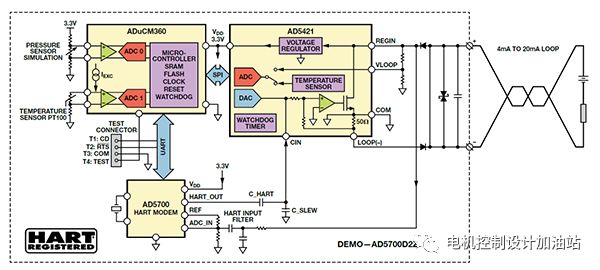 低功耗非常重要,因为环路供电的所有电路的功耗必须低于3.5 mA。图 4 显示了环路中的 HART 通信应用示例。在 AD5700控制板上,AD5700 HART 调制解调器与 AD5421 16 位串行输入环路供电型 4 mA 至 20 mA DAC 和 ADuCM360 微控制器接口连接,以演示用于测量压力(“0”)和温度(“1”)的两个共享数据通道的环路供电型发射器电路。