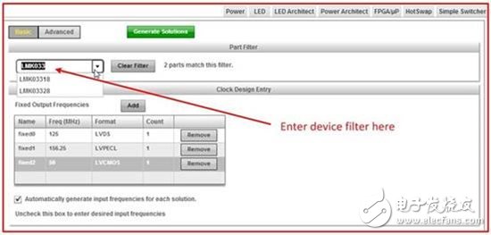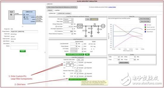 WEBENCH Clock Architect让你从一个下拉列表中选择一个特定的TI计时器件(或者使用常规表示法的多个器件)。图2是你在选择所需器件、敲入输入和输出频率、并且设计一个环路滤波器或仿真相位噪声时的屏幕截图。