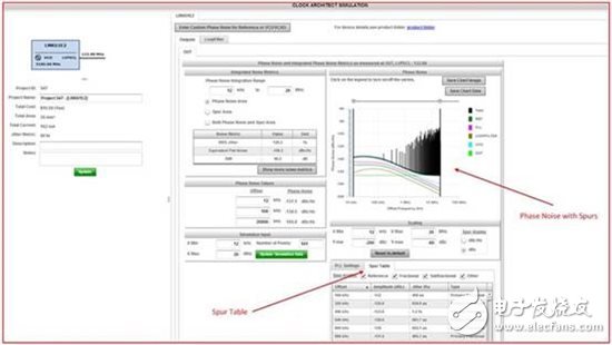 在这款工具中得出的相位噪声仿真值与实际芯片性能进行紧密匹配。然而,直到最近,分数倍分频锁相环 (fractional-N PLL) 的相位噪声仿真并不包含杂散。对WEBENCH Clock Architect的最近一次升级包括PLL相位检测器的建模, 以及针对大多数器件的分数、次分数和其它部件特有杂散的建模。我们一直努力提高这款工具的杂散建模水平,并且不断升级与特定产品相关的功能。图3显示的是一个分数倍分频锁相环的示例,以及它所生成的带有杂散的输出时钟相位噪声曲线图。