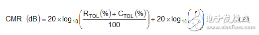 方程式2使用电阻器容差,RTOL,和电容器容差,CTOL,计算出共模抗混叠滤波器在指定频率下的CMR: