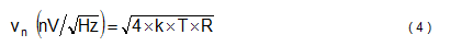 电阻器噪声—也被称为Johnson或热噪声—可被建模为电压源与你的理想“无噪声”电阻器相串联。总的说来,你不希望电阻器热噪声占据整条信号链,那么,将其保持在ADC的噪底以下就非常重要。方程式4计算出电阻器热噪声的噪声密度,vn: