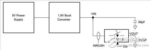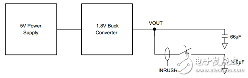 图4显示的是一个5V电源,其电压被一个降压转换器降低至1.8V。在这个1.8V电压轨加电时,在这个系统中施加了一个100µF的电容值。