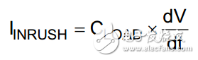 系统启动时,电源将上升到经稳压电压。随着电压增加,一股涌入电流进入未被充电的电容器。当电容负载被切换到一个电源轨,并且必须被充电至那个电压电平时,也会产生涌入电流。进入这个电容器的涌入电流的数量由电压斜升的斜率决定,由方程式1表示: