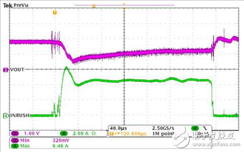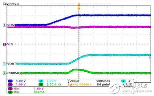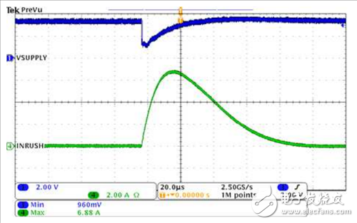 在没有受控上升时间时,这个开关不提供任何的涌入电流管理;图5中显示了其结果。