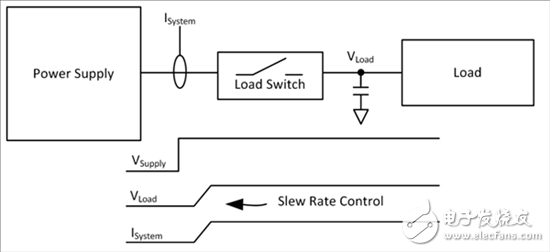 你可以通过增加负载电容的电压上升时间,并且减慢电容器的充电率来减少涌入电流。所有TI负载开关(TPS229xx产品)均特有一个受控输出转换率来减轻涌入电流。图3显示的是针对一个负载开关的常见应用电路。
