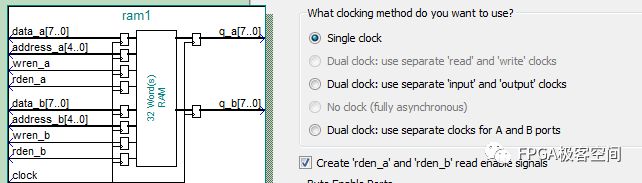 这里可以设置时钟方案,而读使能rden并非必须信号。当使用rden信号时,此信号高电平有效,当不使用rden信号时,给定地址,下一个脉冲数据从q端口送出。