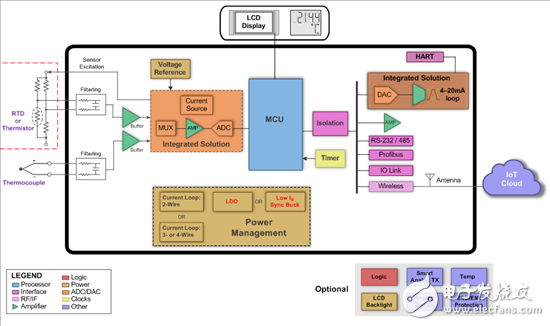 虽然基本传感器变送器电路的 MCU 和数据转换器通常专为低工作电流而优化,但是高性能智能传感器应用中增加的功能导致了电流需求的升高。例如:当该电路包含了诸如隔离、校准和诊断、液晶显示器接口、或无线连接选项(如蓝牙低能耗或无线 HARTâ)等特性时,电流消耗将较大。