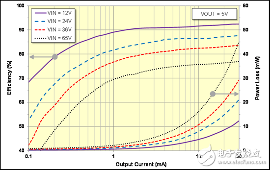 LM5165 中内置的面向智能传感器应用的各种特性包括一种用于实现最佳解决方案尺寸的简单控制架构、用于提供低压差的 100% 占空比能力、一个用于电源轨排序和故障报告的漏极开路电源良好指示电路、在内部固定或从外部可调的软起动 (SS)、以及具有可定制迟滞以提供可编程线路欠压闭锁 (UVLO) 功能的高精度启用。而且,一种可调的逐周期电流限制优化了电感器选择和尺寸。图 3 显示出了对于 0.1mA 至 30mA 负载电流的转换器效率和功率耗散。