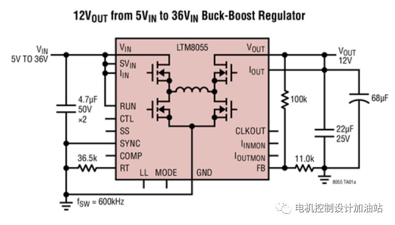 凌力尔特的μModule4开关降压 - 升压型稳压器为输入电压可高于或低于所需输出电压的应用提供集成高效解决方案。这些固定频率的电流模式器件仅需要少量外部元件即可提供最短的设计时间电源解决方案。该产品系列中的最新IC是LTM8055和LTM8056。所述LTM8055(图1)是一个5V至36V IN装置,其能够从一个24V电源提供12V @ 8.5A。该LTM8056具有5V至58V的输入电压范围,并可通过24V电源提供12V @ 5.4A电流。这两款器件都集成了电感,将外部元件数量减少到检测电阻,设置输出电压的电阻分压器,设置开关频率的电阻和大容量输入和输出电容。