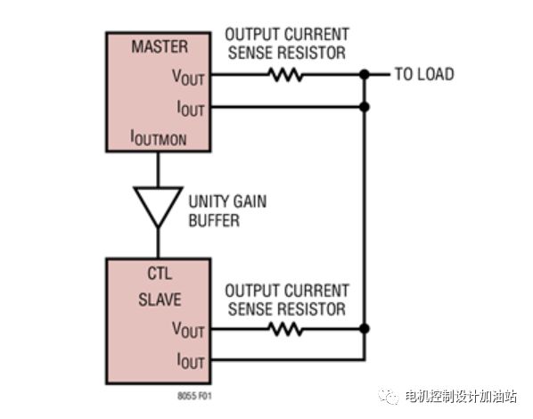 假设输出电流检测电阻器具有相同的值,通过将主机的I OUTMON引脚的电压施加到从机的CTL引脚,两个单元将向负载提供相同的电流。主从电源设计非常简单,请参见LTM8055数据手册的第12页或LTM8056数据手册的第13页。数据手册中的表1参见特定元件值。