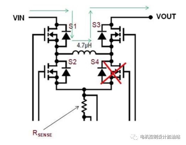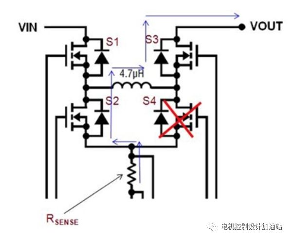 现在观察调节器处于降压模式的情况。在降压模式下(如图6所示),开关S1是电源开关,S3一直处于开启状态,S4一直处于关闭状态,S2是转向开关。当S1导通时,电感电流流过S1,通过电感并流向输出。请注意,在低边检测电阻上,当电感电流斜升时,电流不会流过它; 没有峰值电流限制或逐周期限流。