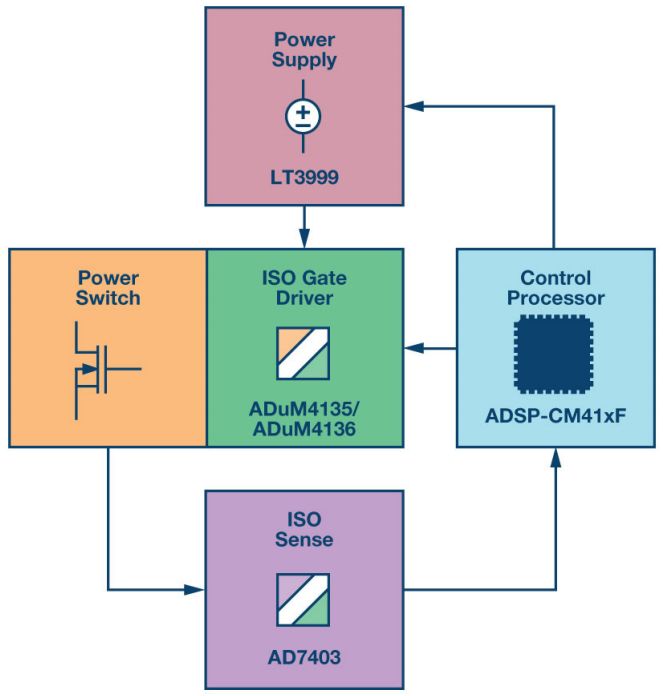 驱动 SiC/GaN 功率开关需要设计一个完整的 IC 生态系统,这些 IC经过精密调整,彼此配合。设计重点不再只是以开关为中心,必须 加以扩大。应用的工作频率、效率要求和拓扑结构的复杂性要求 使用同类最佳的隔离式栅极驱动器(例如ADuM4135),其由高端 隔离式电源电路(例如LT3999)供电。控制须利用集成高级模拟 前端和特定安全特性的多核控制处理器(例如ADSP-CM419F)完 成。最后,利用高能效隔离式 ∑-∆ 型转换器(例如AD7403)检测电 压,从而实现设计的紧凑性。