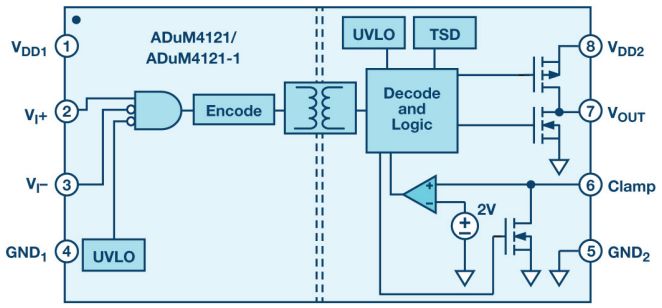 对于更紧凑的纯 SiC/GaN 应用,新型隔离式栅极驱动器 ADuM4121 是解决方案。该驱动器同样基于 ADI 公司的 iCoupler 数字隔离技术, 其传播延迟在同类器件中最低 (38 ns),支持最高开关频率和 150 kV/μs 的最高共模瞬变抗扰度。ADuM4121 提供 5 kV rms 隔离, 采用宽体 8 引脚 SOIC 封装。