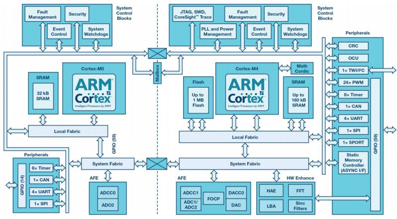 ADSP-CM419F基于ARM® Cortex®-M4处理器内核,浮点单元工作 频率高达240 MHz,而且包含一个工作频率高达100 MHz的ARM Cortex-M0处理器内核。这使得单个芯片可以集成双核安全冗余 性。主ARM Cortex-M4处理器集成带ECC(错误检查与校正)的 160 KB SRAM存储器,带ECC的1 MB闪存,针对功率转换器控制 而优化的加速器和外设(包括24个独立的PWM),以及由两个16 位SAR型ADC、一个14位M0 ADC和一个12位DAC组成的模拟模块。 ADSP-CM419F采用单电源供电,利用内部稳压器和一个外部调 整管自行生成内部电压源。它采用210引脚BGA封装。