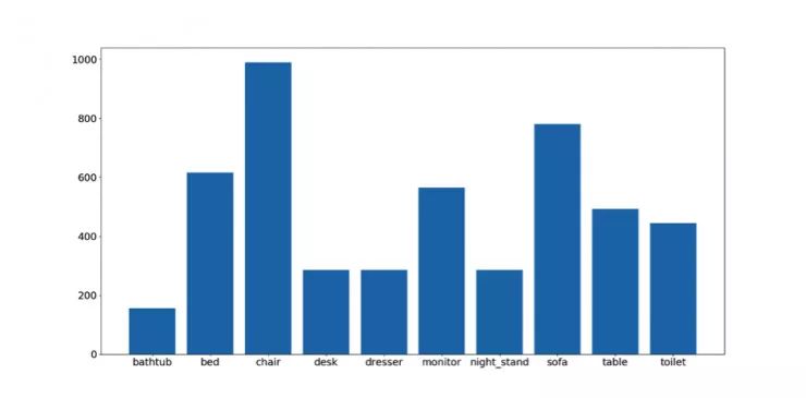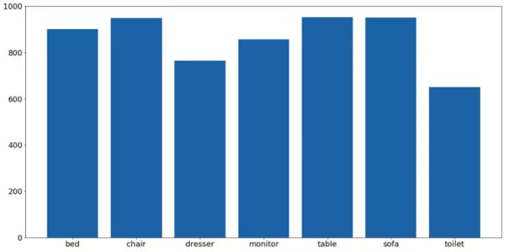 这样数据集看起来就比较均衡了。除马桶外,几乎每个物体类别都包含有近 1000 个样本。其他物体类型之间的不均衡可通过分类权重进行修正。