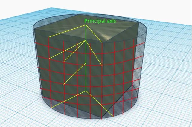 绿色是主轴,红色是网格,黄色是几何投影线。