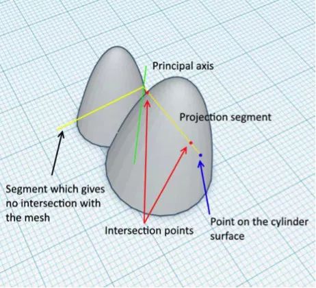 现在将每个网格节点垂直投影到主轴上并获取一组投影点。投影点集合由P表示。投影线集合由 S 表示。