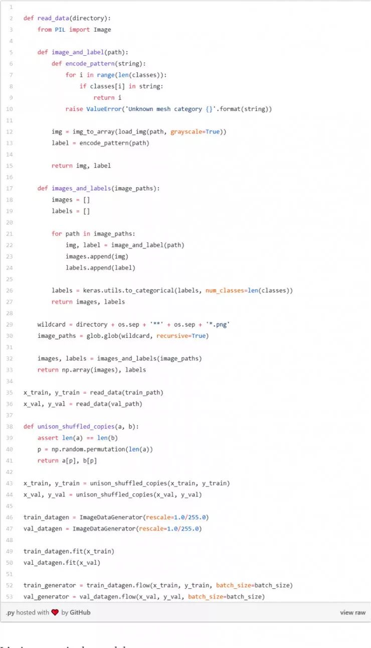 模型准备就绪并编译完成后,读取数据,然后将其刷新,并通过图像尺寸调节创建 ImageDataGenerator。请注意,数据预先按照 70:15:15 的比例进行了训练、验证和测试。由于图像是合成的,并且代表了 3D 物体,因此数据无法进行扩增,因为: