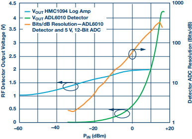 相比之下,图5中的HMC1094对数放大器传递函数还显示出它在线性工作范围内的斜率不变。这意味着若要实现远低于1 dB的分辨率,则使用较低分辨率的ADC (10位甚至8位)就足够了。