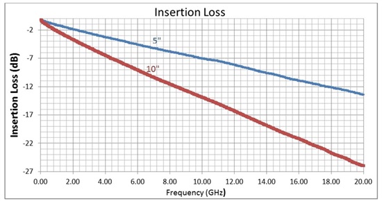 插入损耗是一个常见术语,用来描述互连部分的传输损耗。它是只有和没有互连部分的两种情况下负载处电压的比值。网络分析仪能按振幅和相位测量插入损耗。图1展示了FR4板材上两条PCB走线的典型插入损耗:一条走线长5英寸(蓝色),另一条走线长10英寸(红色),但两者具有相等的走线宽度(5 mil)。正如您可从图1中看到的,插入损耗特性与低通滤波器表现出的特性一样,当频率增加时信号衰减量增大。损耗随着PCB走线的长度呈线性增加。
