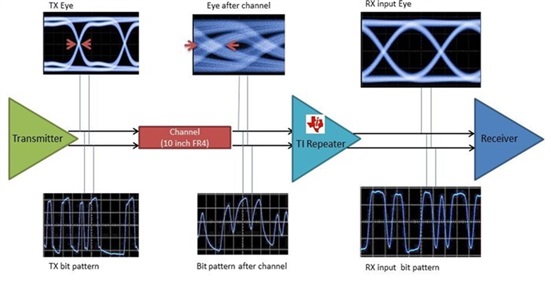 图3展示了具有CTLE的TI DS125BR800A,可消除由互连部分引起的ISI抖动。通过选择与互连部分的插入损耗特性相匹配的适当均衡量,该Repeater可清除ISI抖动并在接收信息的目的端提供干净的数据眼图。