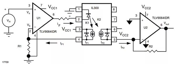 U1 放大器(Texas Instruments,TLV9064IDR)驱动 IL300 LED 以产生反馈光电二极管电流 (IP1)。前馈光电二极管电流 (IP2) 通过隔离式 R2 电阻器发送,该电阻器位于隔离式 U2 放大器的反馈环路中。在此电路中,增益等于 R2/R1。另外,Vout信号不受 VCC1相对 VCC2的变化和两个接地的影响。