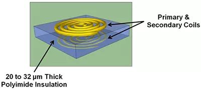 电感隔离采用两个上下堆叠的线圈,线圈之间通过介电材料隔离开来。施加交流信号后会产生一个磁场,进而在次级线圈中产生一个电场。