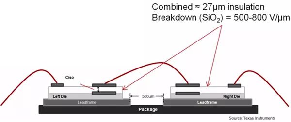 电容隔离元件的构造包括紧密相邻的两块电容板,两板之间夹有电介质。二氧化硅 (SiO2) 材料可植入电容板之间,以产生这种隔离能力。在此配置中,SiO2的击穿电压为 500 - 800 V/微米 (µm)。此类隔离器的典型距离为 27 µm,因此隔离栅隔离能力为 13.5 kV 至 21.6 kV。