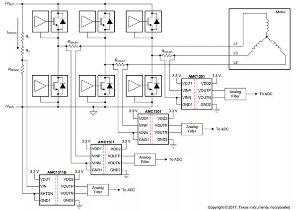 电机控制环境中的电感负载易受高开关电压摆动的影响。为确保正常运行,需要不断监控此频繁变化的环境。使用电阻分压器降低电机驱动电路中的高共模电压的隔离电压检测,就是相应的 AMC1301 和 AMC1311 隔离放大器电机控制应用。