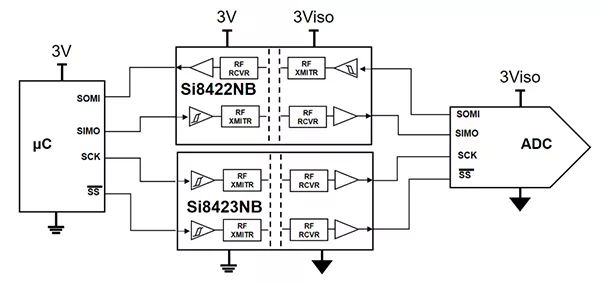 一个电容式数字隔离实例就是,使用 Silicon LabsSI8422和SI8423数字耦合器连接微控制器和 ADC 之间的数字线路。
